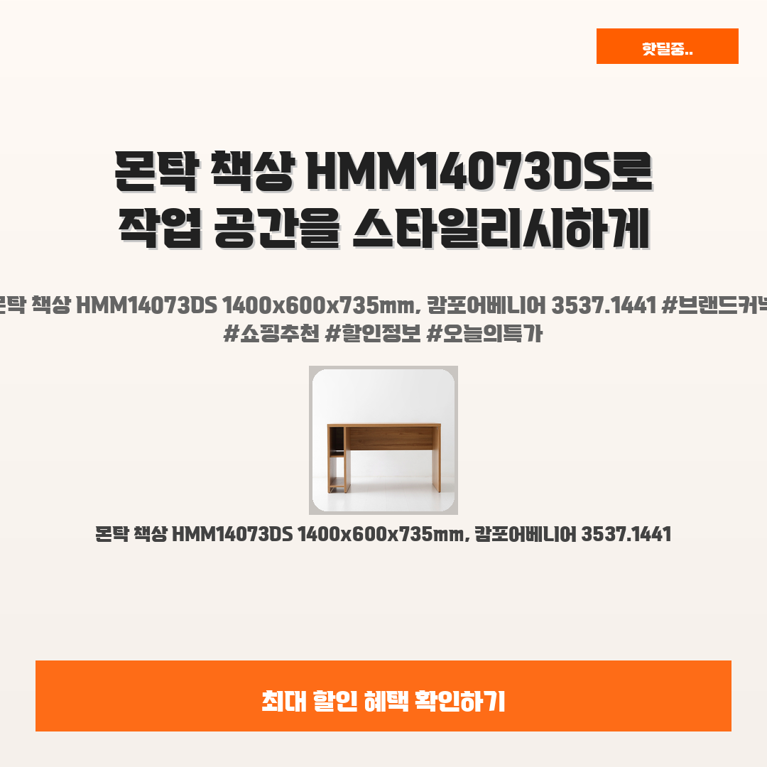 🛍️ 이 포스팅은 네이버 쇼핑 커넥트 활동의 일환으로,판매 발생 시 수수료를 제공받습니다.오늘 소개할 제품은 단언컨데,,바로 몬탁 책상 HMM14073DS 1400x600x735mm입니다!요즘 많은 분들이 편안하고 스타일리시한 작업 공간을 원하시죠?그래서 준비된 이 책상은 어떤 공간에서도 어울리는 완벽한 솔루션입니다.작업할 때 불편한 책상이 고민이라면 걱정 마세요! 몬탁 책상으로 인테리어까지 고려한 스마트한 선택을 해보세요. 디자인과 기능성이 조화를 이루어, 효율적인 작업 환경을 만들어줍니다.이 책상은 캄포어베니어 3537.1441 소재로 제작되어 내구성과 아름다움을 동시에 제공합니다!지금 구매하시면, 후회 없는 선택을 하실 수 있을 거예요!몬탁 책상 HMM14073DS 1400x600x735mm, 캄..